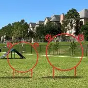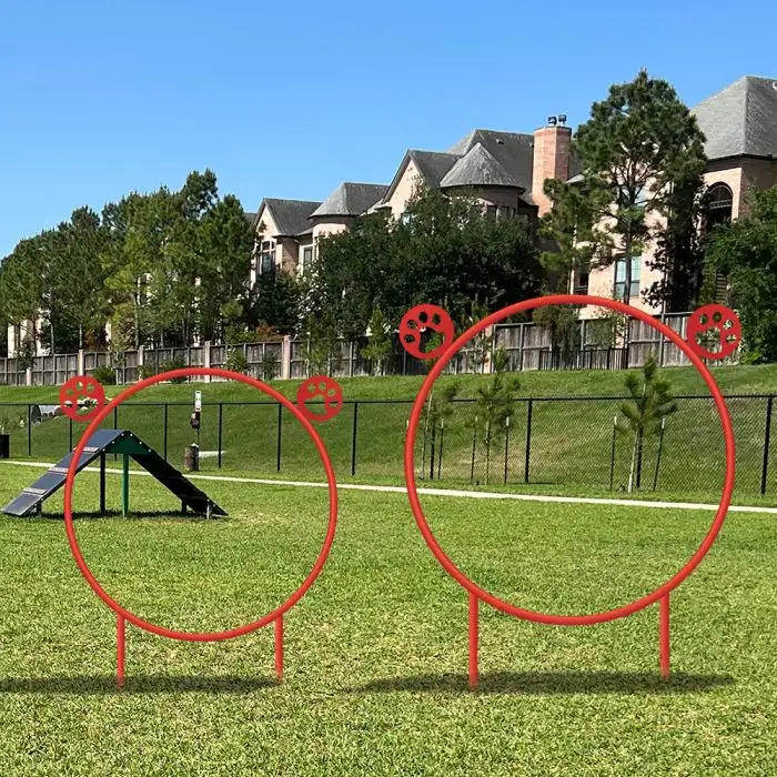 Introducing our Deluxe Hoop. Each dog park hoop in made from 5/8" heavy-duty steel that won't bend or break - no matter what. Tested for extreme durability and stability, each hoop jump fits dogs of all sizes and ability. Choose from 2 sizes and 4 colors. With fun paw print accents, it is a must-have for any dog park. All dog hoops are in stock and ship today!